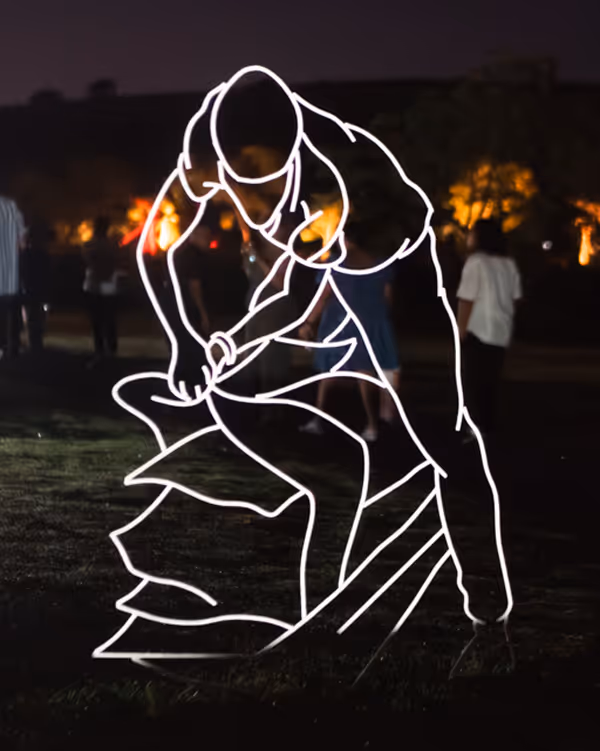 This year these precarities have not simply disappeared - what with Eskom and loadshedding providing brutal irony to curating a project about light and adding to the challenges of what it takes to live in this contemporary world. However in this 2023 collection artists do play with and lean into form more deeply, on the materiality of light itself and its manifestations, shifting this sprawling outdoor exhibition into an experiential adventure of the many possibilities that light may be moulded into, from place holder, and a marker to a thing of wonder in and of itself. So while themes do abound and hold the gravitas and centre of this collection of work, light is deployed in a myriad of evocative ways, an invitation to experience a range of forms and in some instances leading us to reflect on some of the pressing issues of our time.