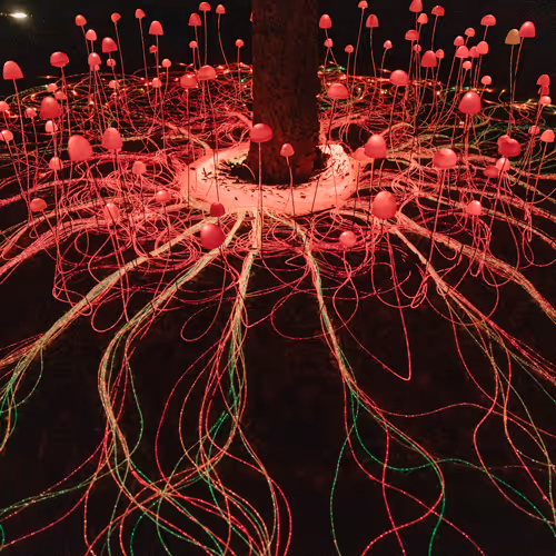 These works will live amongst works that hold up and honour ecological presence: Jenna Burchell's Songsmith will complement UK based artist Stevie Thompson’s ravishing Mycelium a mesmerising display of colour and light using thousands of thin fibre optic strands to represent the huge network of mycelium often growing right below our feet. Similarly Berco Wilsenach’s Written in the Stars and Kamil Hassim’s impressive Event Horizon immerse the audience in what is understood as vast, unknown spaces that are atmospheric and in constant flux. These enormous presences in our lives are used by the artists productively, to imagine and bathe in the infinite.