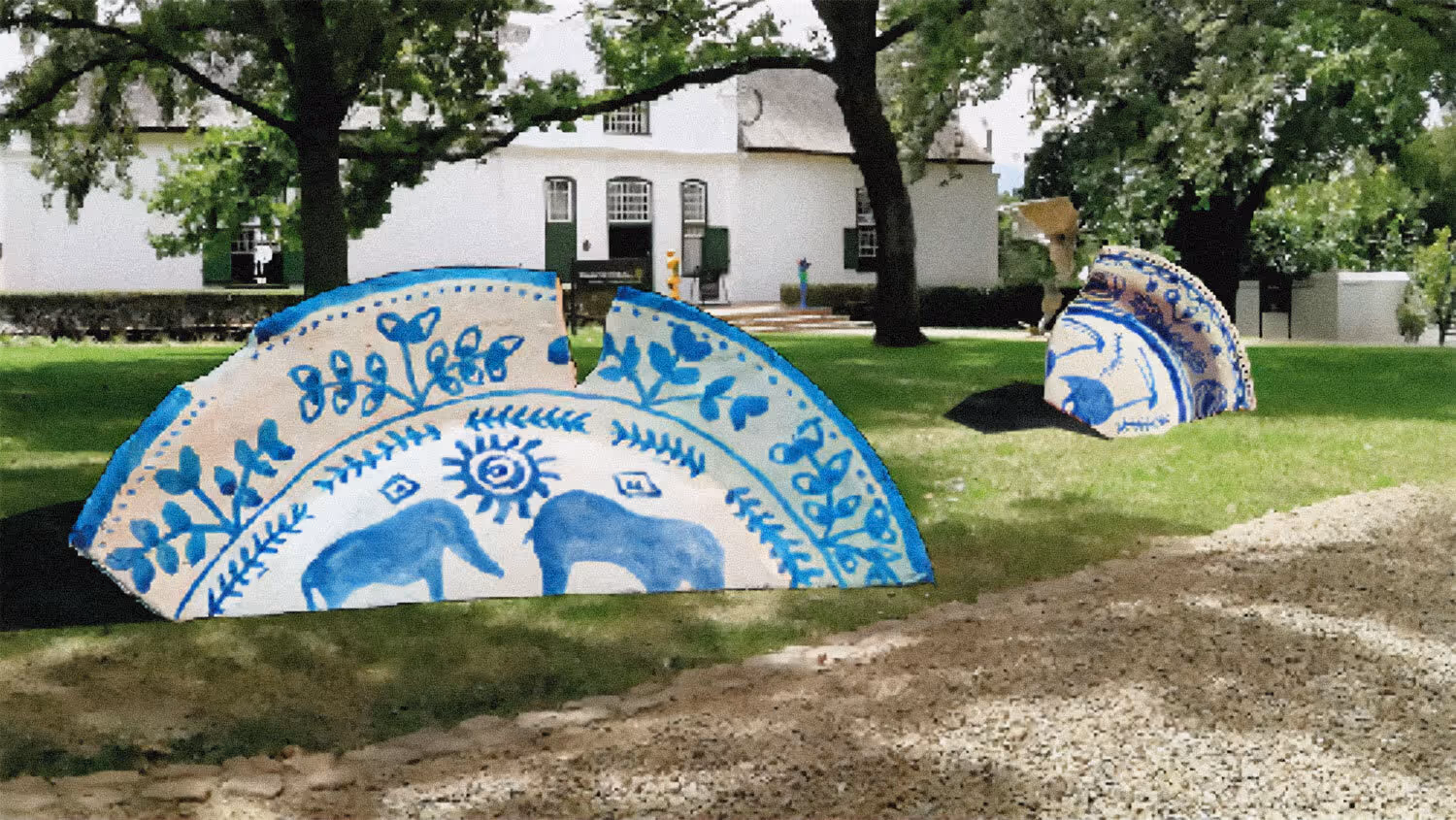 In ‘Artifacts’, the artist explores the insights archaeological excavations on Cape Dutch farmsteads provide into the daily lives and cultural traditions of early European colonisers in South Africa – especially between the 17th and 19th centuries. These pieces frequently feature Dutch ceramics, showcasing the colonial impact. The blue and white VOC designs and patterns are easily recognisable on these artifacts.