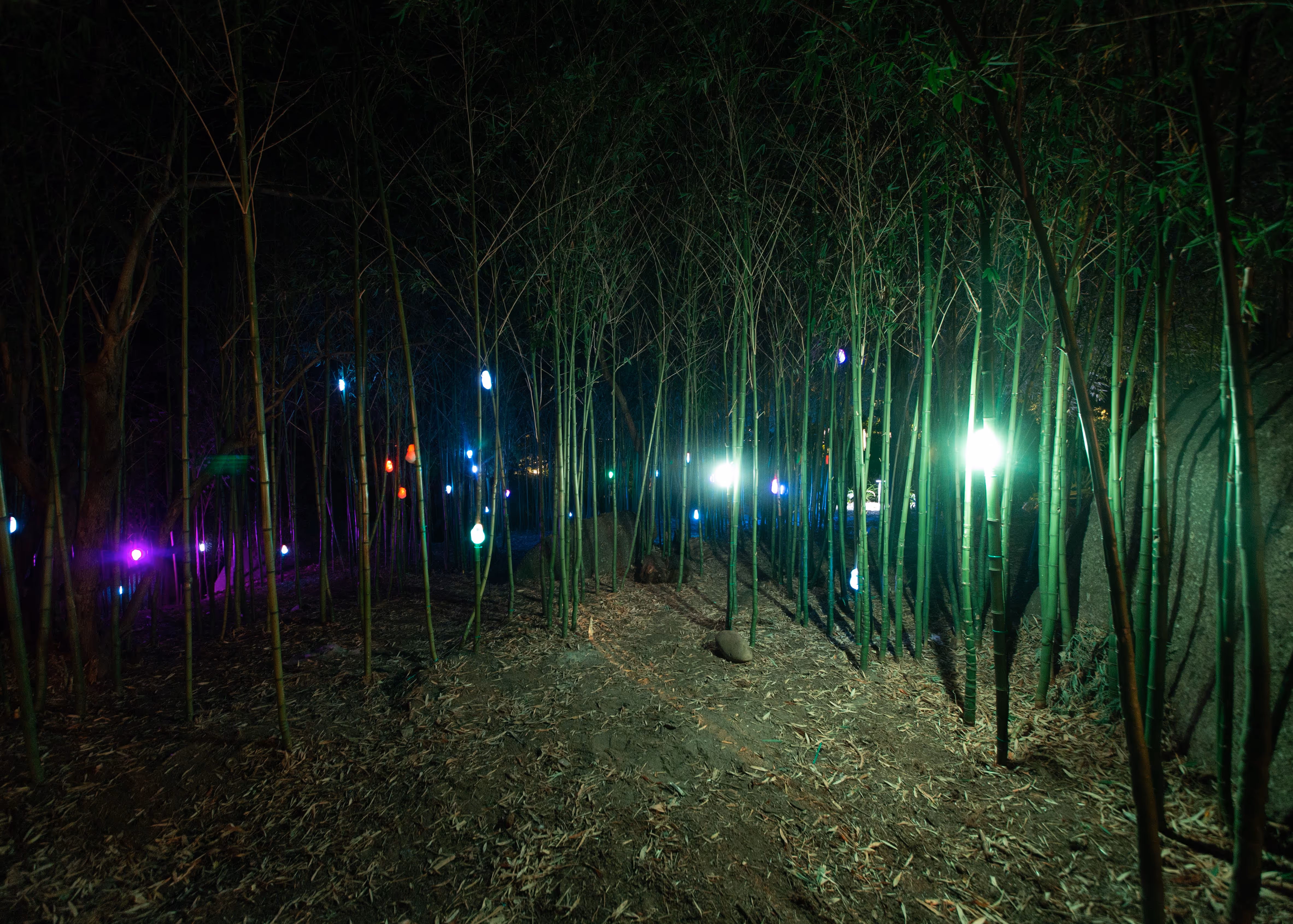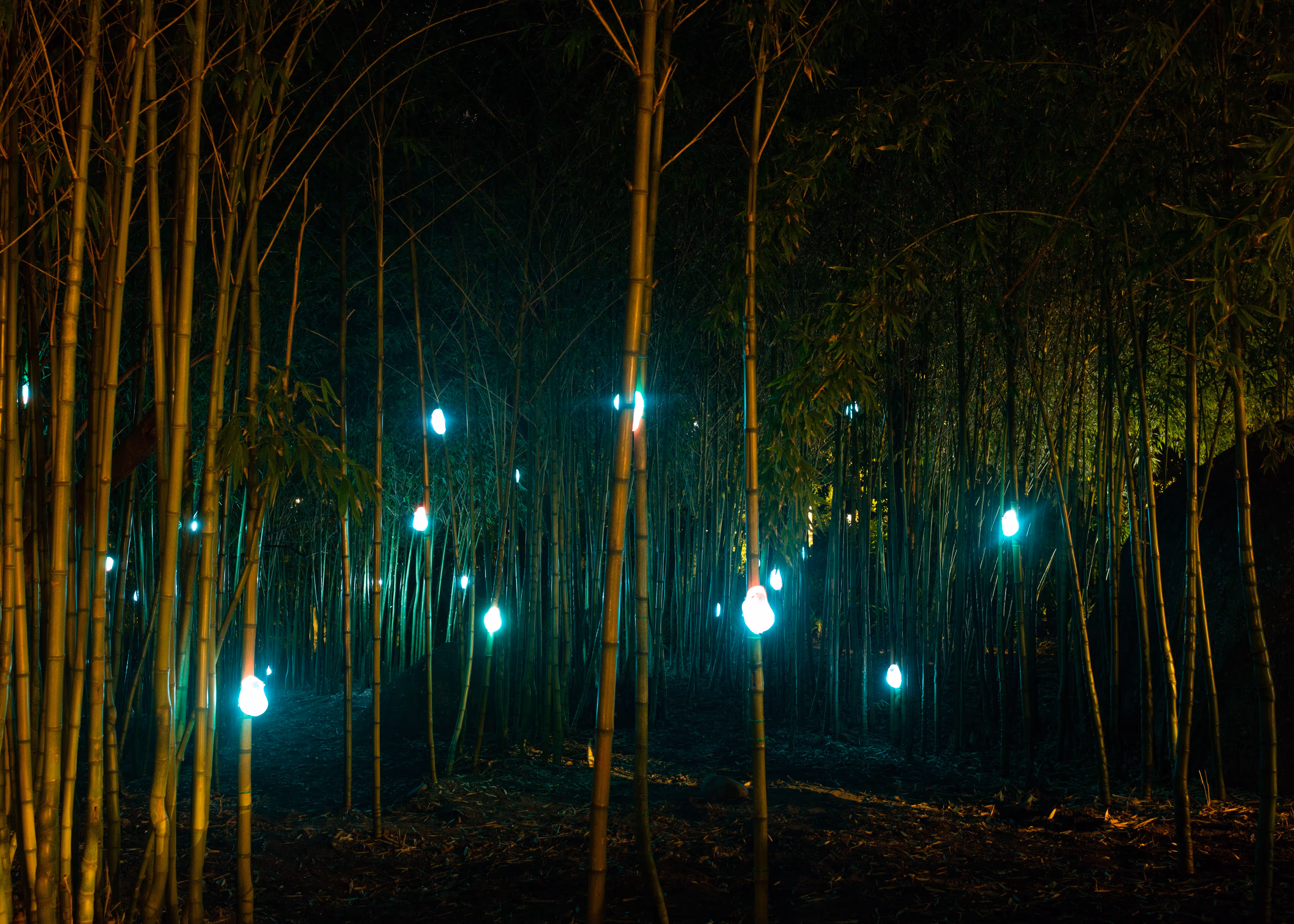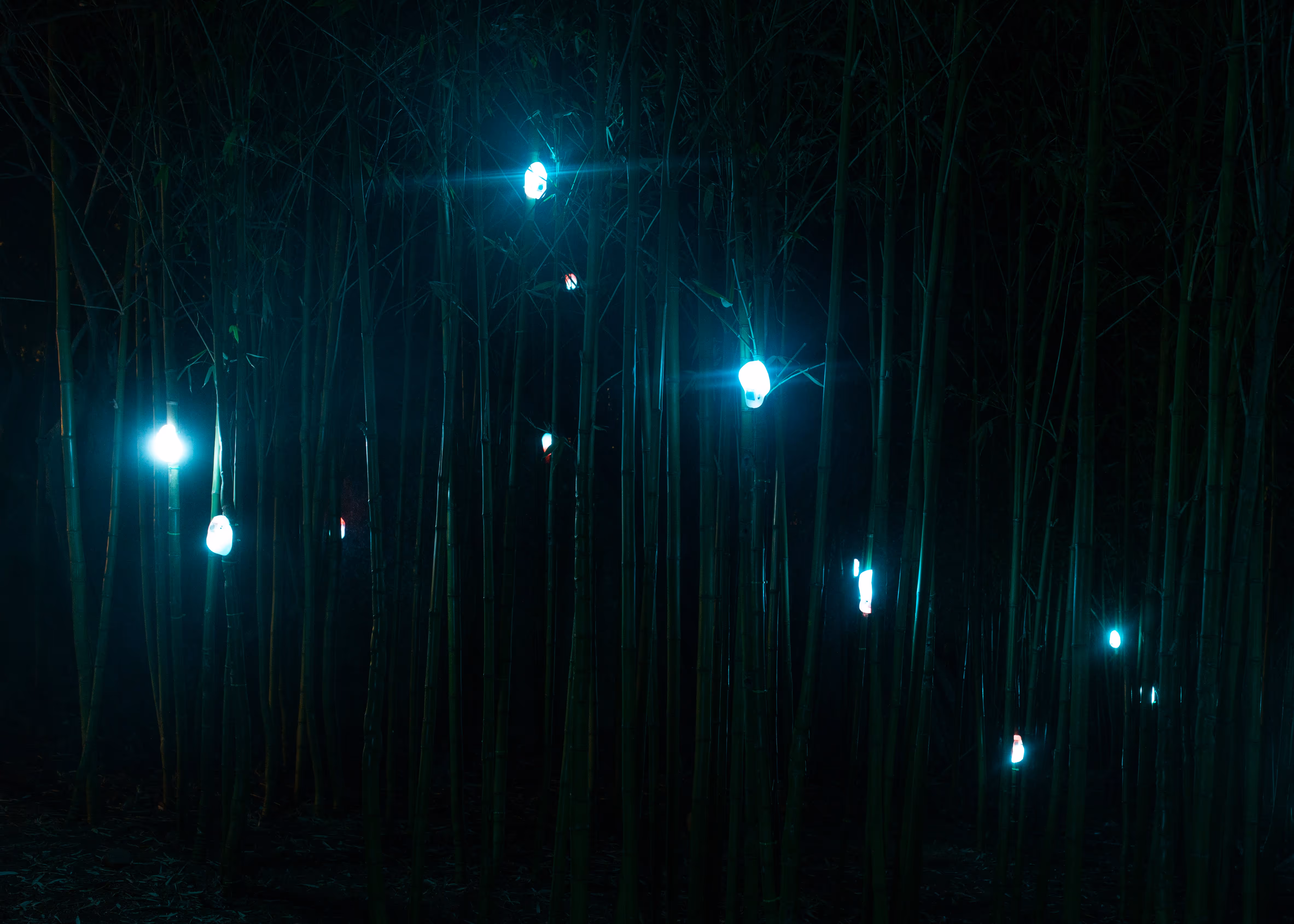 Digital Parasites comprises a networked swarm of glowing, organic forms attached to bamboo trunks that respond to the viewer’s presence. While being a formally beautiful and experientially magical piece, the work alludes to humankind’s destructive effect on the environment and our fraught relationship with nature, highlighting the cost that technological progress has had on the natural world.