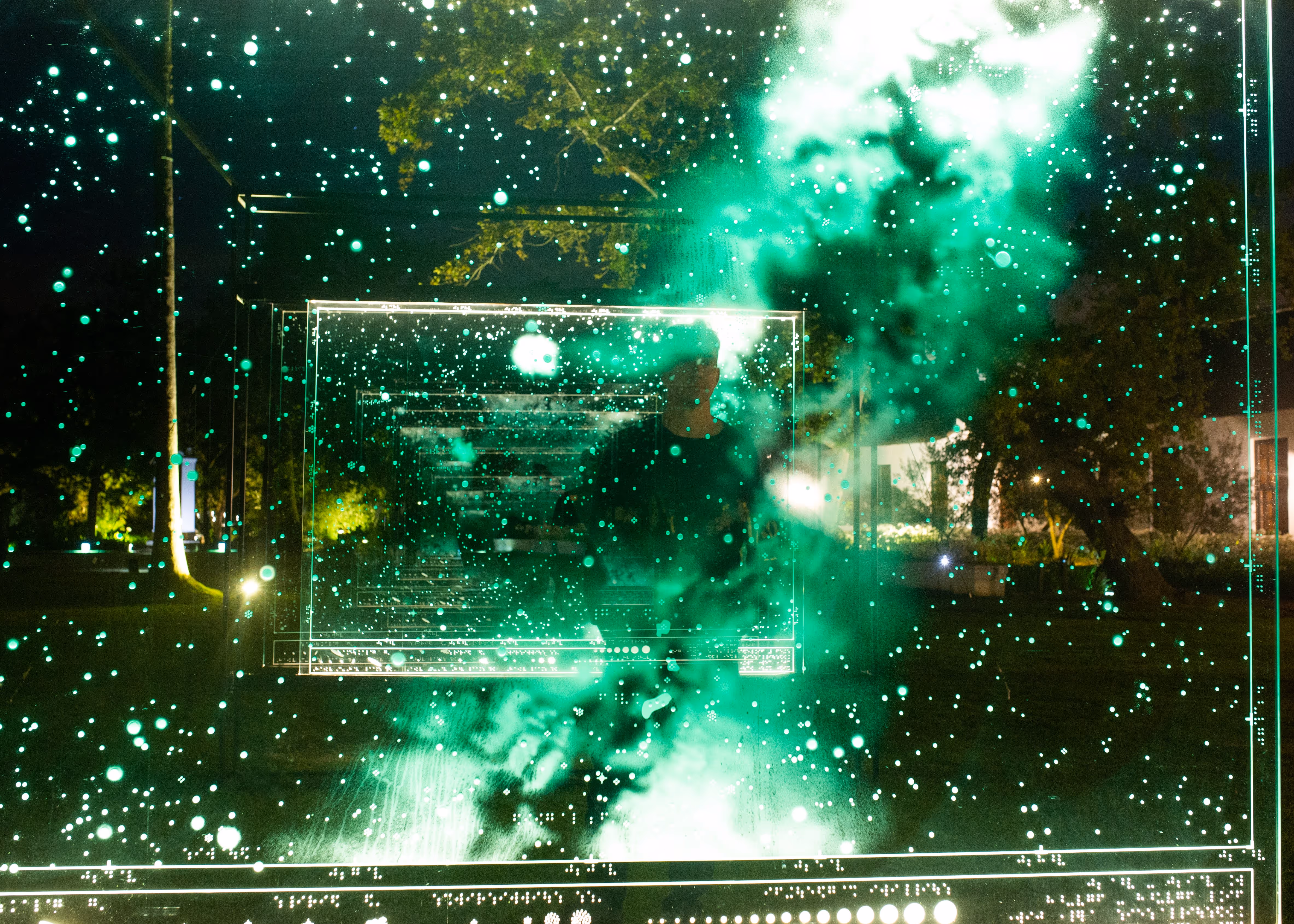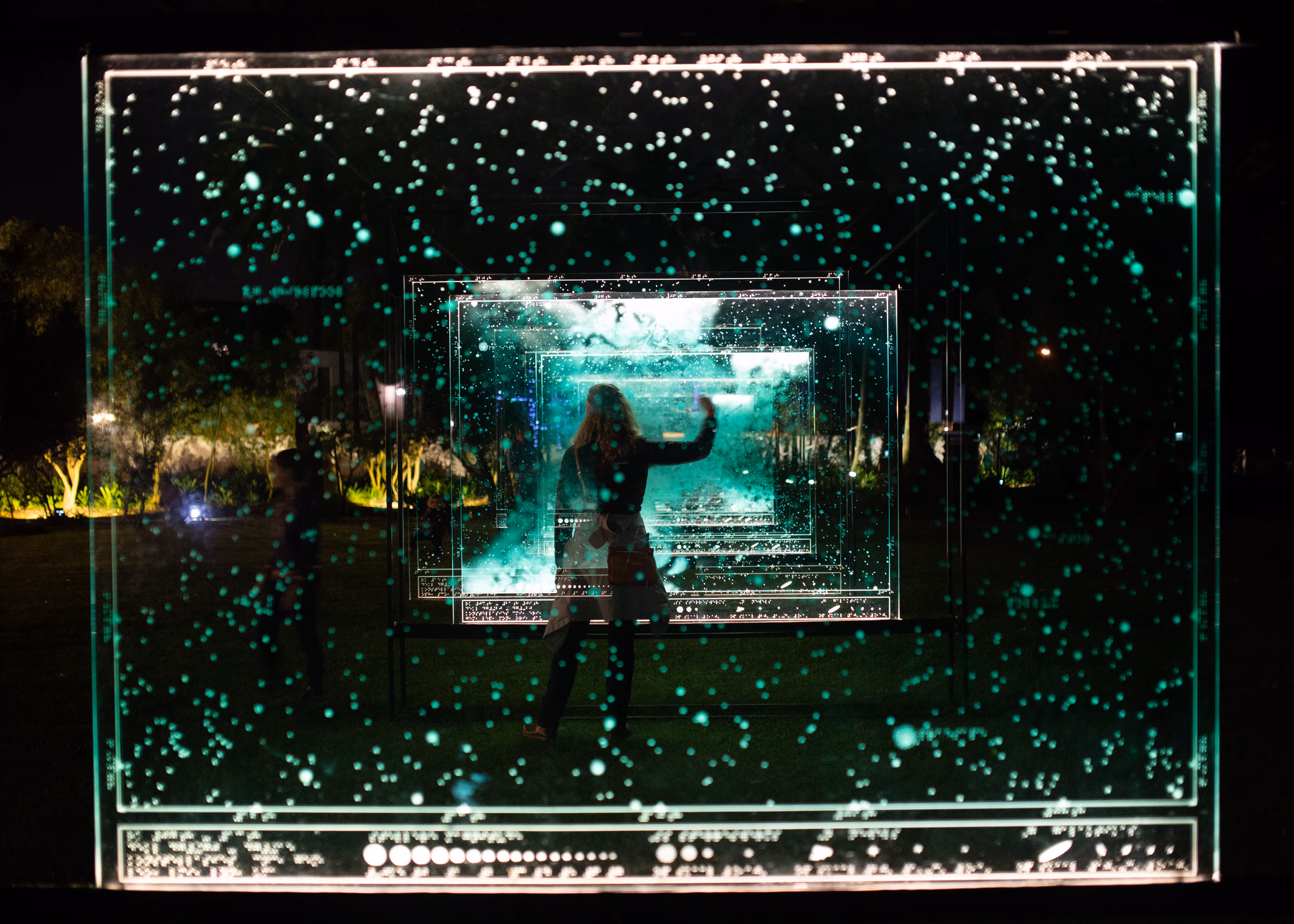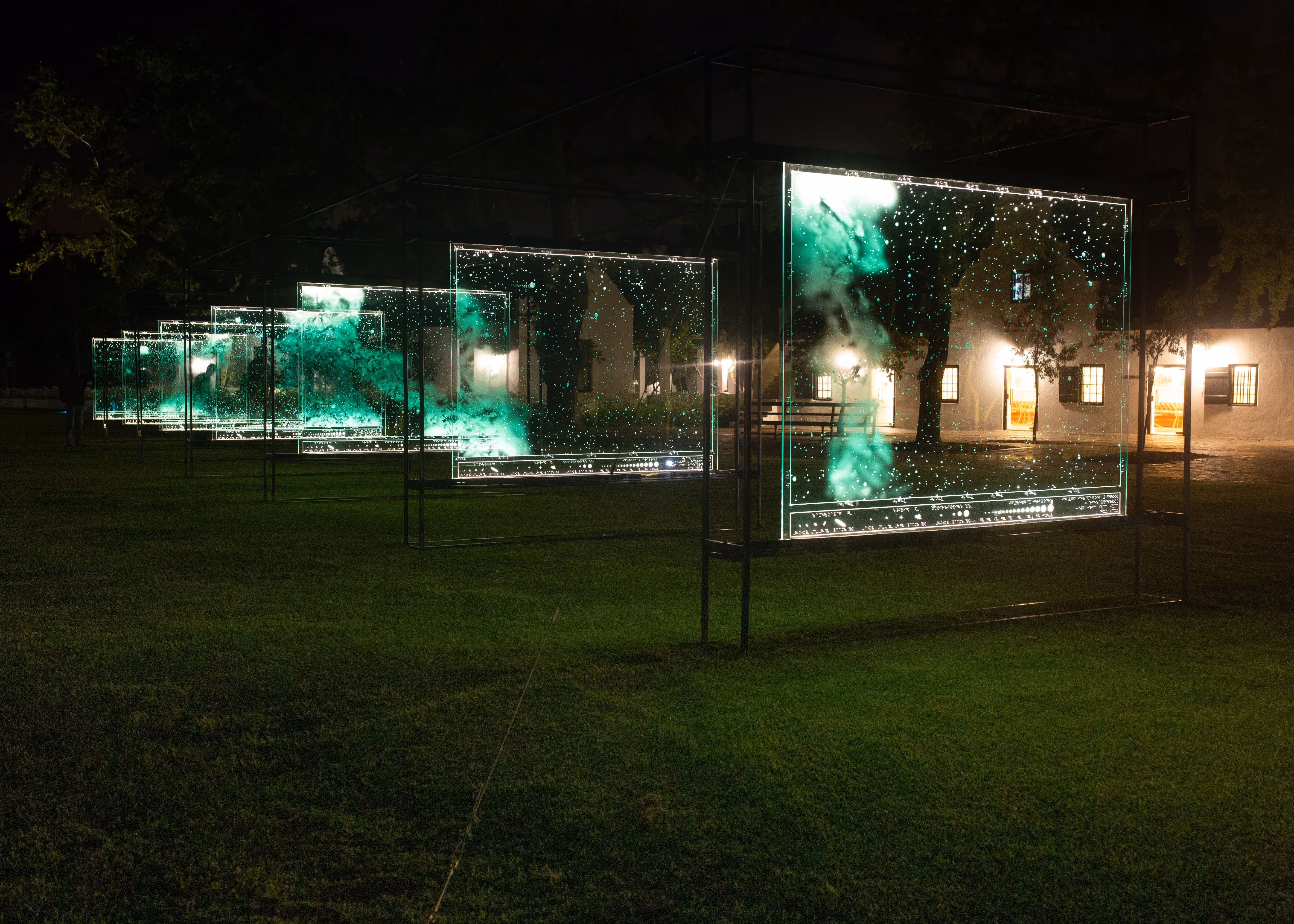 In die sterre geskryf (Written in the stars) was created by Berco Wilsenach in 2009 as part of a body of work called Project for the Blind Astronomer – an artistic investigation into different decoding systems with which our visible night sky can be mapped and explained to a visually impaired audience. The panels are lit from within, creating an effect of thousands of dots floating in mid-air.
